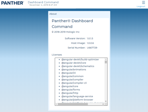 The About screen displays software, host image, serial number, and license attribution information for Dashboard Command.