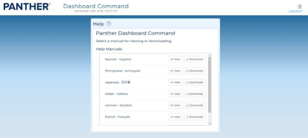 To access the Help screen, select Help from the Navigation Menu.Select View to open the Panther Link- Dashboard Command and Data Sharing Application Sheet or select Download to save it in the preferred language.