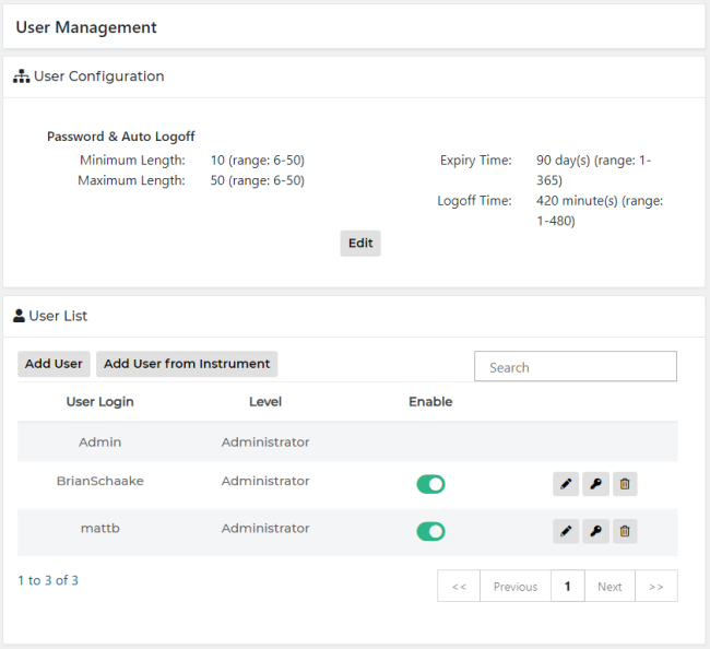 The User Management screen allows users to configure the password length requirement, password expiration period, and inactivity period for auto log-off and to edit the user list.