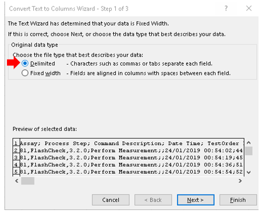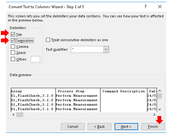 Select the option to delimit by Tab and Semicolon and click Finish.