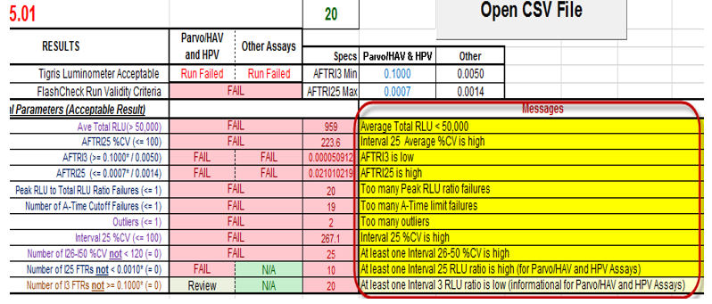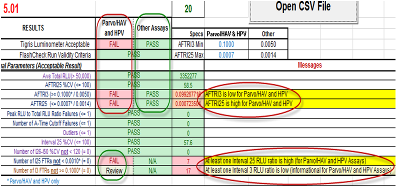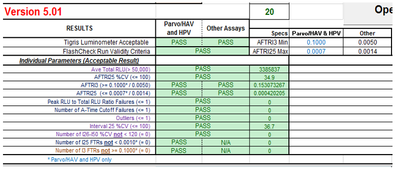 - The FlashCheck procedure is considered PASS if each individual Result Interpretation on the Spreadsheet passes. A spreadsheet that states “PASS” for both the “TIGRIS Luminometer Acceptable” and “FlashCheck Run Validity Criteria” parameters denotes a passing FlashCheck run for the data analyzed.