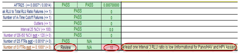 The following image highlights the results that are displayed if any replicate contains an interval 3 RLU/total RLU value that is below 0.1000.