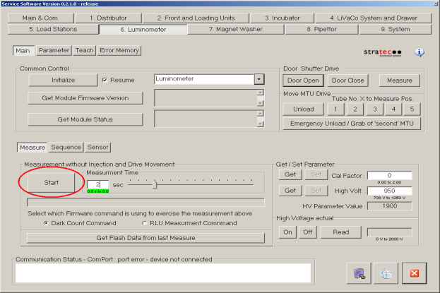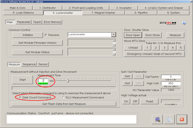 In the Measure tab, verify that the Measurement Time is set to 2 seconds and verify that Dark Count Command is selected.