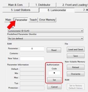 From the 6. Luminometer tab, select Parameter. Enter 1 in the Authorization Code field and click Set.