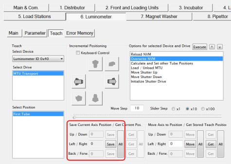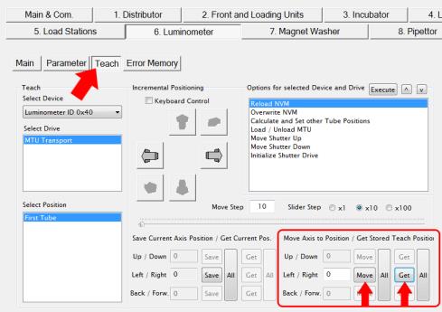 - Select Teach. Click the Get button in the “Move axis to Position/Get Stored Teach Position” section on the bottom right of the screen.