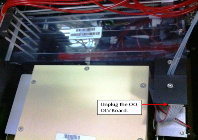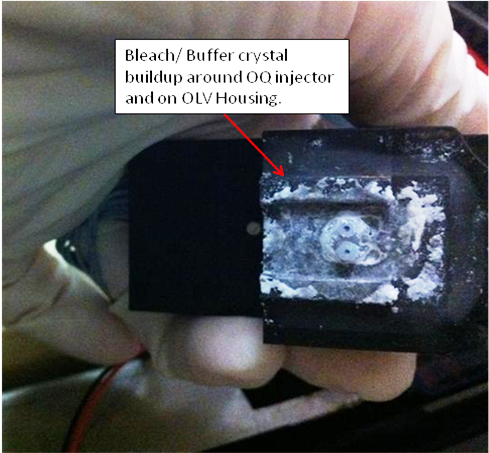 Note—If the injector is more than one year old, or if fluid is found in the housing or near the OLV board, the OQ Injector is faulty and needs to be replaced. - Clean the housing and injector with 50% bleach to prevent any contamination.