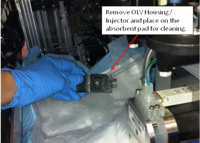 Remove the Output Queue OLV Housing/Injector (the Output Queue will still be connected to the pump) and place on the absorbent pad.