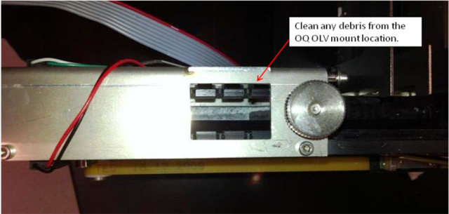 Clean any debris from the Output Queue OLV mount location with bleach and DI water.