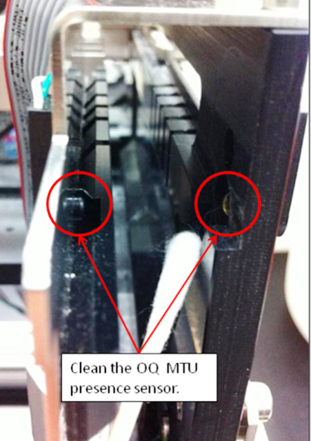 Using a cotton swab and ethanol, wipe clean the Output Queue MTU presence sensor.