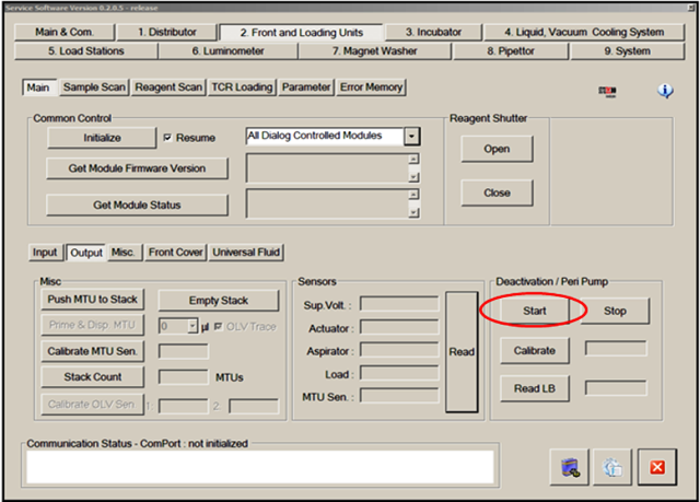 Run the Peri Pump to clear any grease from the injector tips by selecting Start in the Deactivation/Peri Pump section of the Output Queue tab in Service Software.