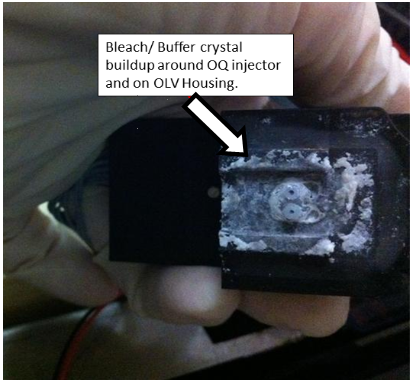 | Note—If fluid is found in the Housing, or near the OLV board, the OQ Injector is faulty and needs to be Replaced; or, if the Injector is more than 6 months old, Replace It. |