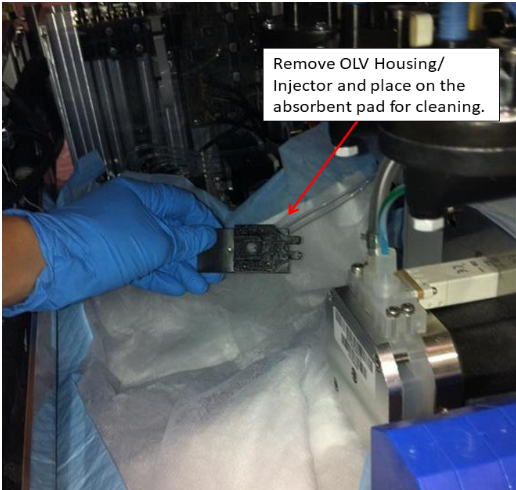 Remove the Output Queue OLV Housing/Injector and place on the absorbent pad.