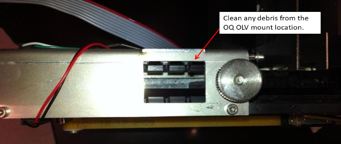 Clean any debris from the Output Queue OLV mount location with bleach and DI Water.