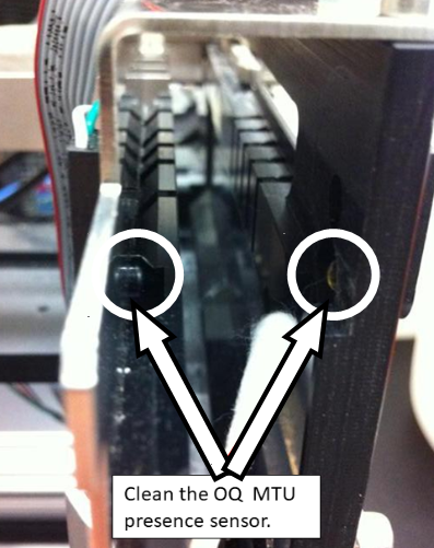 Use a cotton swab and ethanol to wipe the Output Queue MTU presence sensor shown below.