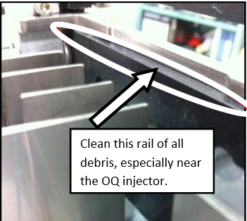 Clean the black plastic Output Queue entrance rail.