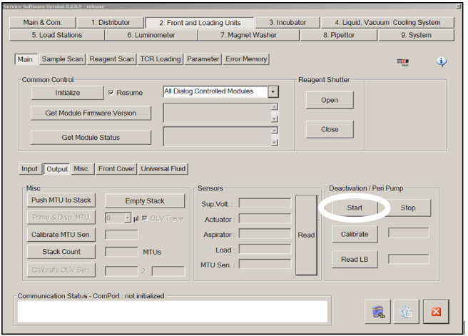 Run the Peri-Pump to clear any grease from the Injector tips by selecting Start in the Deactivation / Peri Pump section of the Output Queue tab.
