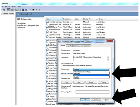 From the Disk Defragmenter Properties pop-up, change Startup type from Disabled to Manual and click Apply.