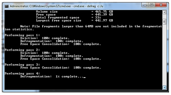 When the analysis is complete, defragmentation begins and proceeds through multiple passes as noted on the display. The larger the hard drive and/or the greater the degree of fragmentation, the longer defragmentation will take.