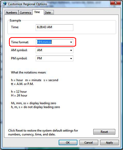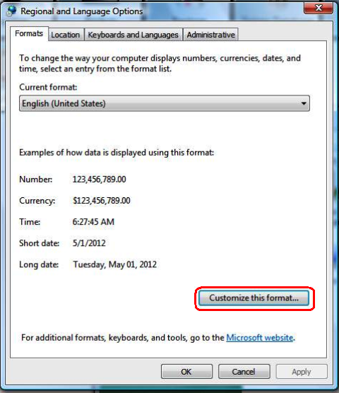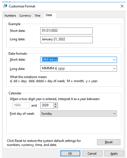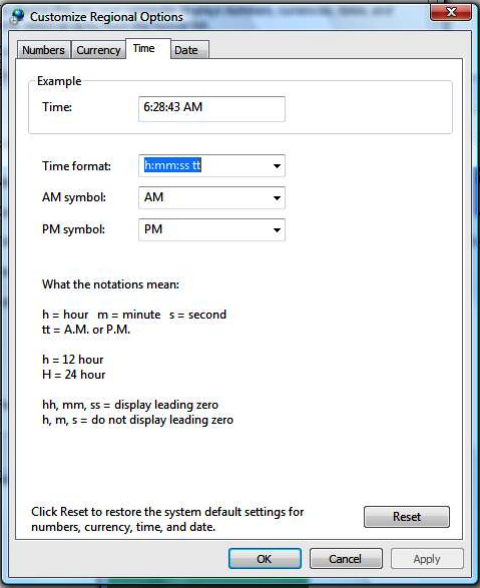 Use the drop downs for Short Time and Long Time to set the time for a 12-hour or 24-hour clock.