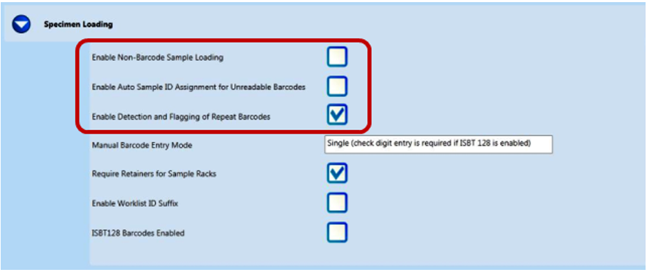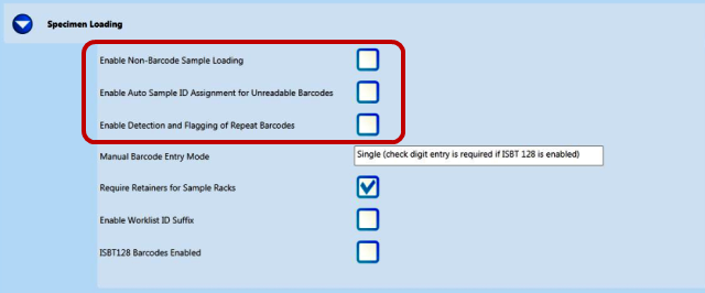 Ensure that Enable Non-Barcode Sample Loading and Enable Auto Sample ID Assignment for Nonreadable Barcodes are not checked. If they are checked, clear the check boxes.