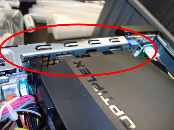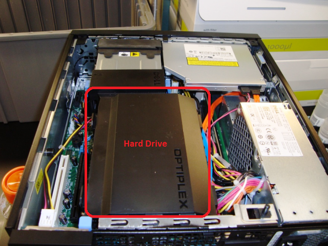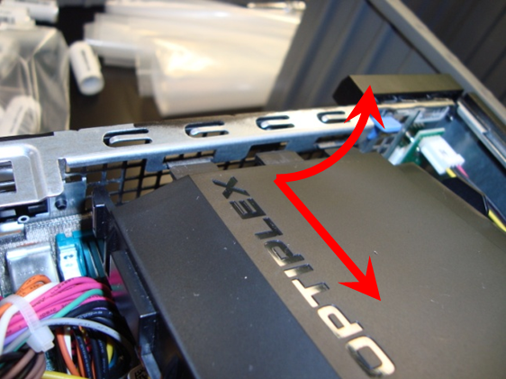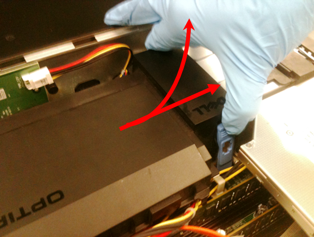 Remove the hard drive by squeezing the blue latches, lifting and moving the hard drive assembly away from the back of the PC. Set the hard drive aside. No cables need to be disconnected.