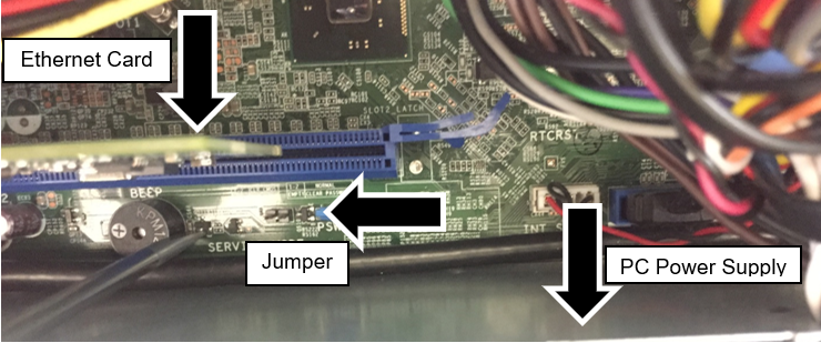 Locate the password jumper on the motherboard. Look for the letters PWD, PSWD, or PSWDCLR. The jumper is located between the PC Power Supply and the Ethernet Card.