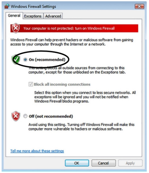 Note—If using Windows 7, select the Turn on Windows Firewall option for both Home/Work and Public network location settings.