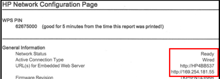 Network Configuration Page, under the General Information section, verify that the Network Status indicates Ready and that the Active Connection Type indicates Wired. Note the URL(s) for the Embedded Web Server.