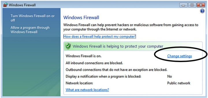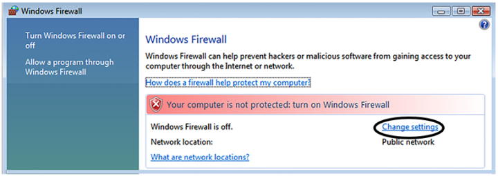 Windows Firewall window is not already displayed, select Start ► Control Panel ► Windows Firewall. - Select Change Settings. (For Windows 7, select Turn Windows Firewall on or off.)
