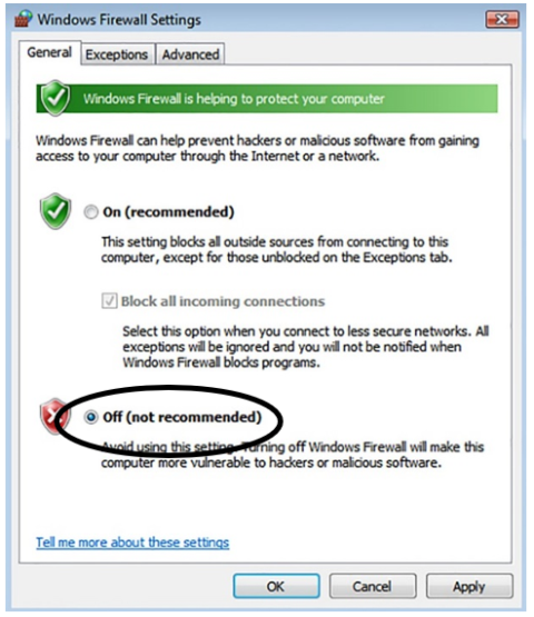 to disable the Windows Firewall. Press OK, then close the Firewall window.