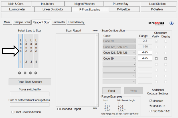 Under the Select Lane to Scan section, press Lane 1.- Wait until the Reagent Bay barcode scanner activates and focuses on the lane.