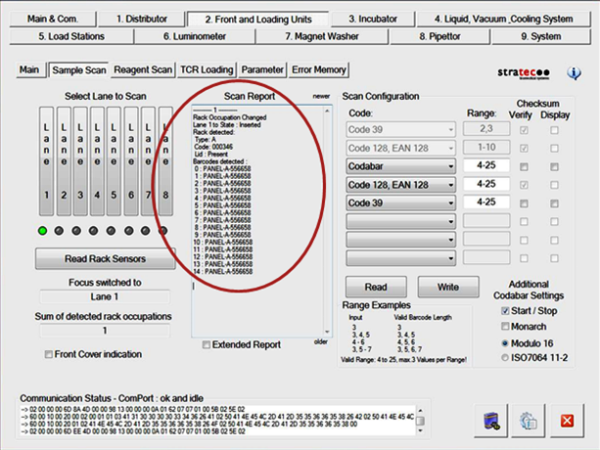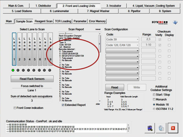 In the Scan Report box, the module will report all read barcodes from the Reagent Rack.- Check the scanned barcodes. Note whether any barcodes were unable to be read (a blank space will appear instead of the barcode if it was unable to be read). Check whether any of the barcodes were read incorrectly.
