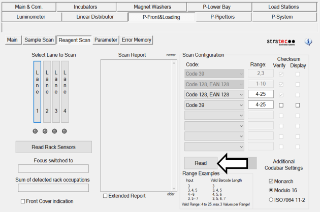 Under Reagent Scan, press the Read under Scan Configuration. If installing a new scanner, this will display the default configuration.