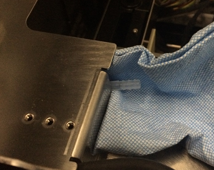 - Verify that there is no fluid present behind the Reagent Bay, especially around the barbed interconnect and quick disconnect fittings.