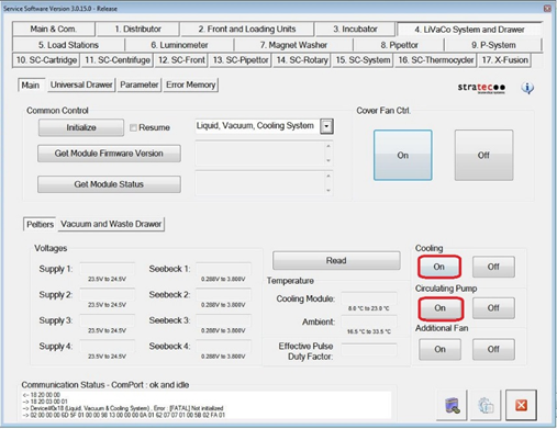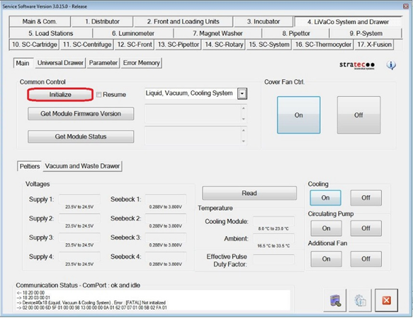 Under the 4. LiVaCo System and Drawer tab, Initialize the Liquid Vacuum and Cooling Module.