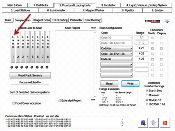 Under the Select Lane to Scan section, press Lane 1.- Wait until the Sample Bay barcode scanner activates and focuses on the lane.