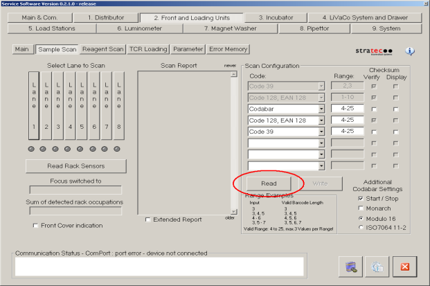 Under Sample Scan, press the Read under Scan Configuration and confirm that the scanner is configured as expected.- Remove all Sample Racks from the Sample Bay.