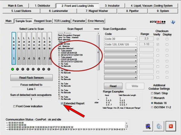 - If any barcodes are consistently unable to be read properly it may be helpful to check the Extended Report option and read it again. This will display additional information about each tube position in the sample rack. The Extended Report will display three items at each rack position: whether a sample tube is present or not (which is determined by whether the barcode scanner can read the small ‘no tube present’ barcode that is normally blocked by a sample tube), the detected barcode format, and the barcode interpretation itself.