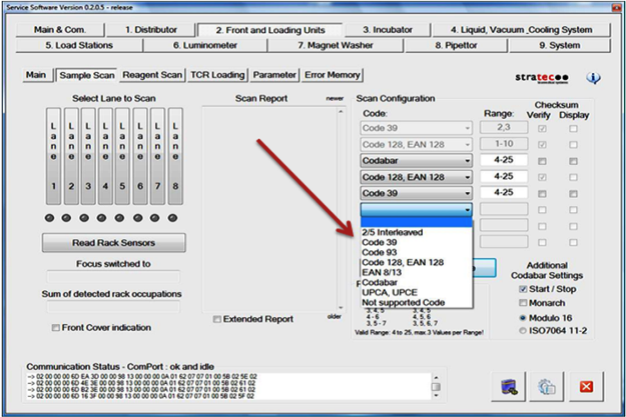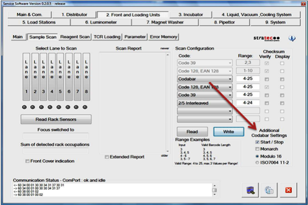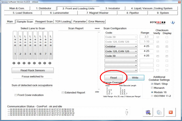 Under Sample Scan, press the Read under Scan Configuration. If installing a new scanner, this will display the default configuration..- For the following steps do not remove the Code 128, EAN 128 configuration (4–25 digits) from the barcode configuration, even if the customer does not use this format. The format is required to read any controls or calibrators.