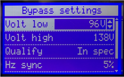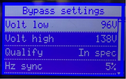 Refer to the Input Voltage Observed column in the table above to determine the appropriate settings to be used in the following steps. The Output Voltage, Bypass Low Limit %, and Bypass High Limit % settings will be based on the Input Voltage observed in the previous step.