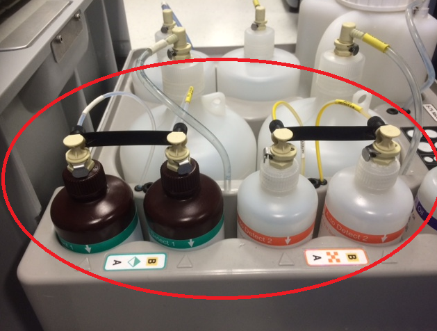 - Place the Auto Detect 1 and Auto Detect 2 bottles back in the Universal Fluid Drawer and re-connect the bottles to the fluidic lines.