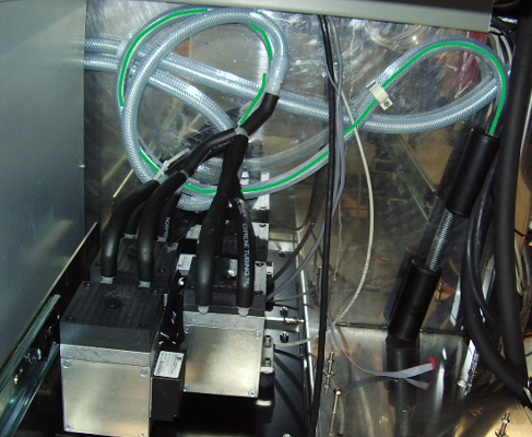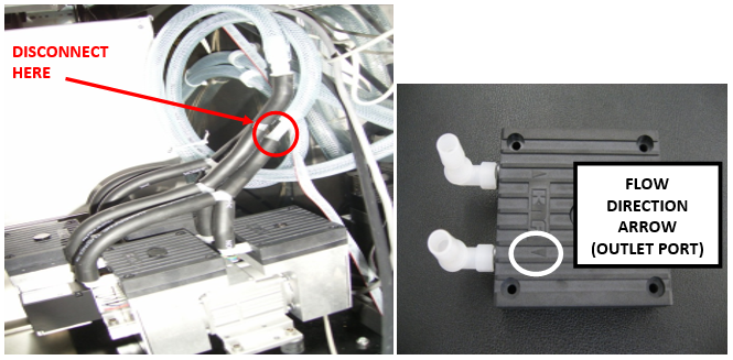 - This will be connected by a series of "L" and "Y" fittings and black 10 mm ID tubing to the outlet side of each of the four pump heads as indicated by the flow direction arrow on the top of the heads.