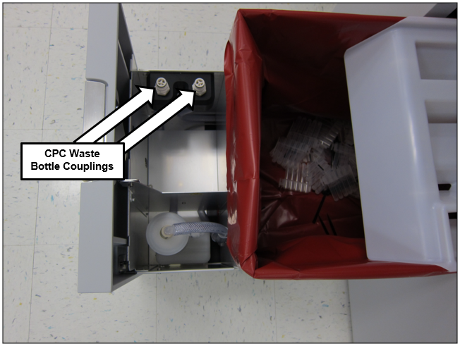 Use an adjustable wrench to remove the 2 existing CPC waste bottle couplings in the drawer.