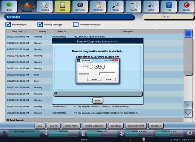 To terminate the session, either close the PRO360° Remote Diagnostics application on the FSE laptop or select Cancel in the PRO360° popup window.