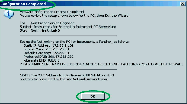 Enter the information from the Firewall Configuration Wizard Configuration Completed screen.