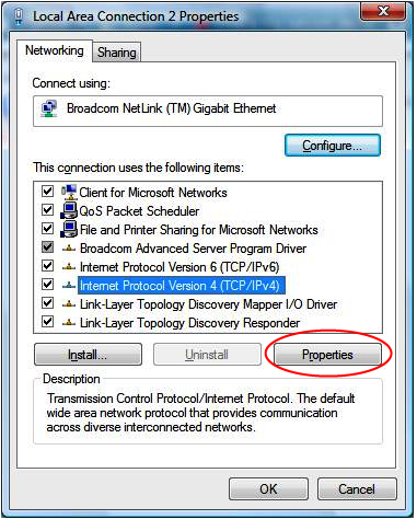 Select the Local Area Connection that is currently enabled; the other connection should have a red X next to it.- Position the mouse pointer over the enabled Local Area Connection, click the right mouse button, and select Properties.