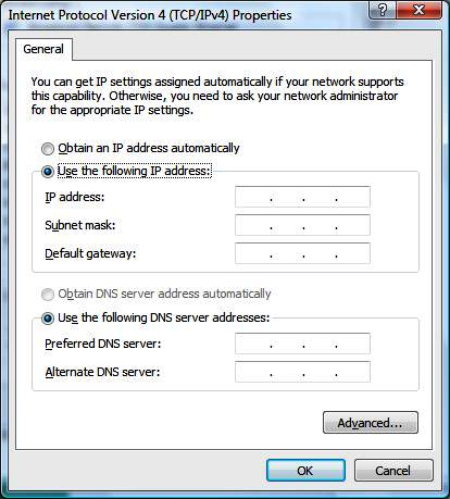 Note—At this point, a dialog box appears requesting the IP address, Subnet mask, Default gateway, Preferred DNS server, and Alternate DNS server values. - Select the Use the following IP address option