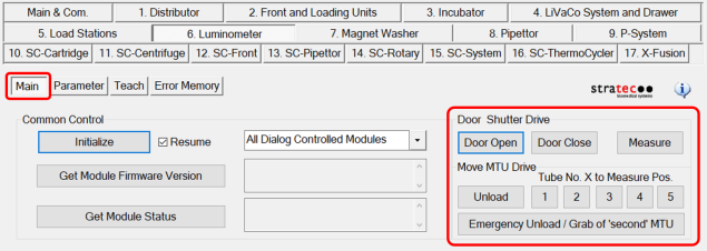 - Emergency Unload button (is used if 2 MTUs are placed into the Luminometer by accident)