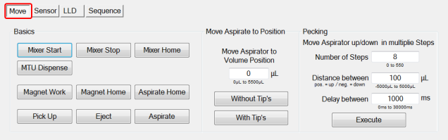 - Mixer Home (moves the mixer to the home position)