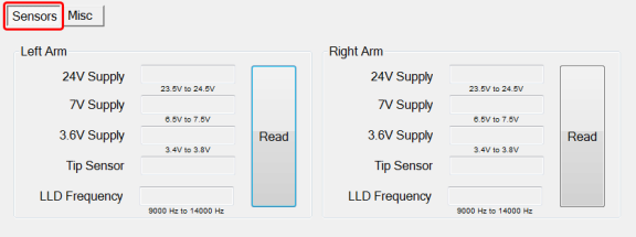 - Read button (displays voltages to each arm, Tip Sensor status (present or not) and LLD Frequency)